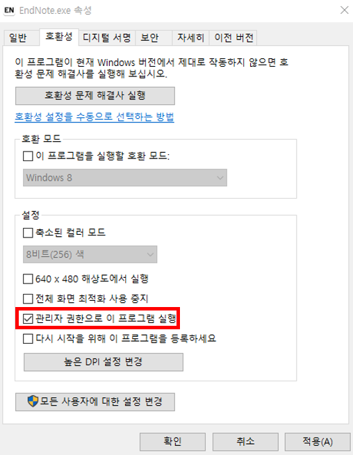 3. EndNote.exe 속성 창에서 "호환성" 탭을 클릭합니다.