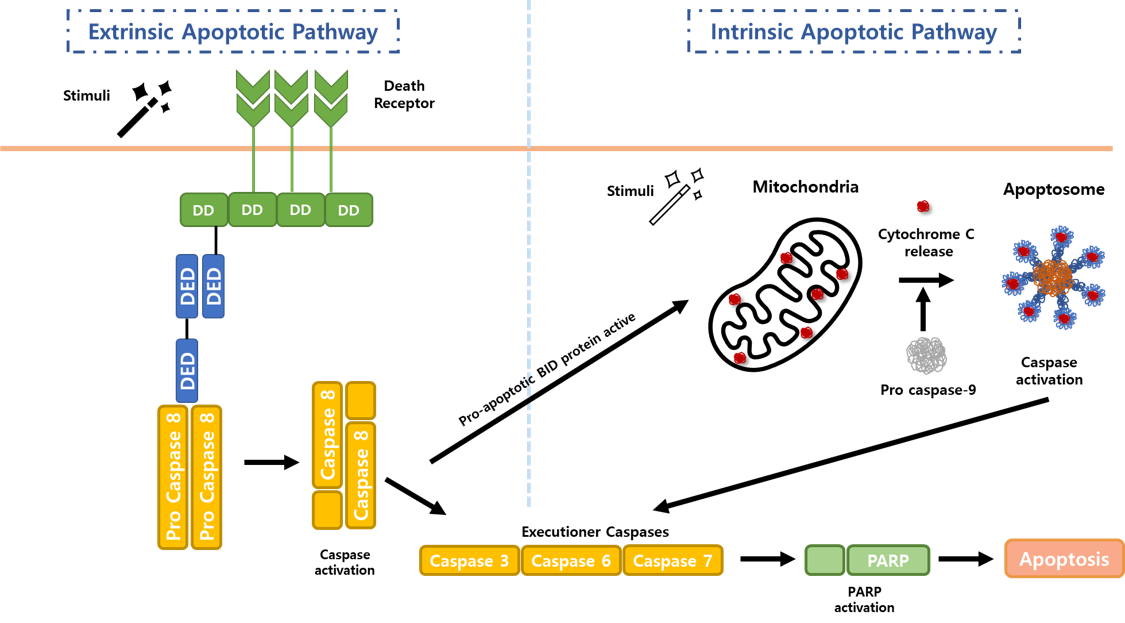- Mechanism: 외부 자극이 Death Receptor를 통해 전달 → Caspase 활성화 → DNA 절단